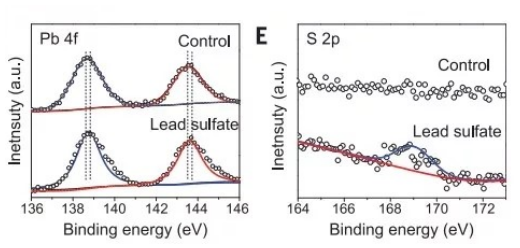黄劲松团队[4]于2019年在science杂志上报道了防水型钙钛矿,主要方法是原位形成钝化层,众所周知,不溶于水的钝化层可以有效的隔离水分子的侵入,作者将钙钛矿与硫酸盐或磷酸盐离子反应,将卤化铅钙钛矿表面转化为水不溶性PbSO4, Pb3(PO4)2稳定原位钝化层,从而使钙钛矿的寿命大大增强,同时器件的效率可达21.1%。于是作者利用XPS表征发现测试结果都证明表面有硫酸铅修饰层的存在。且Pb的峰位置有一定程度的移动,表明钝化层与碘化铅层有一定的相互作用,使钝化层与钙钛矿结合在一起。