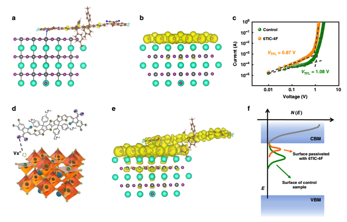 (2)Alex K.Y. Jen教授团队[6],成功使用路易斯碱小分子钝化无机钙钛矿膜,作者优化后的PVSCs获得了16.1%的冠军效率和15.6%的认证效率,提高了光稳定性,是迄今为止效率最高的全无机倒置钙钛矿。于是作者进行一系列的研究路易斯碱6TIC-4F的作用,结果发现丁腈(C-N)基团可以有效降低钙钛矿膜的陷阱密度,从而显著抑制钙钛矿膜的吸收。其中作者利用DFT计算进行构象优化,通过优化后的构象可以看出,F-Pb、N-Pb、S-Pb三种键经过几何配位后均稳定形成,值得注意的是,S-Pb键只有在6TIC-4F处于晶界边缘时才能形成,这可能是由于侧链的强烈立体效应。当6TIC-4F分子被去除时,在铅暴露的表面有较高的电子密度,这是表面缺陷形成的显著特征。这些计算结果清楚地表明,该6TIC-4F钝化的方法有力的消除了表面缺陷。