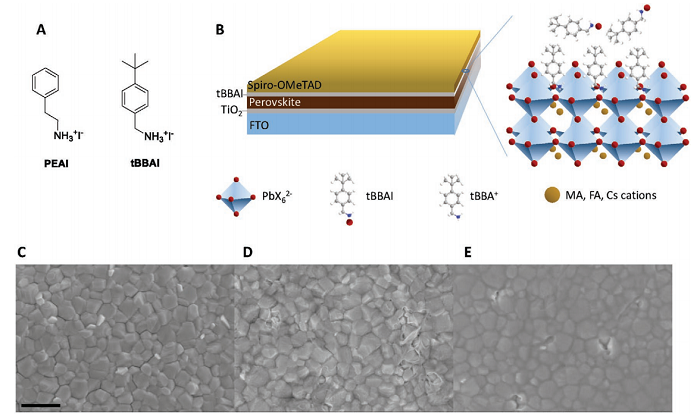 C–E)分别为纯钙钛矿膜,PEAI钝化的钙钛矿膜和tBBAI钝化的钙钛矿膜的SEM图像。