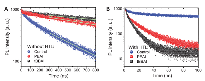 B)含HTL的样品的TRPL测量,不带界面层,带PEAI和带tBBAI。