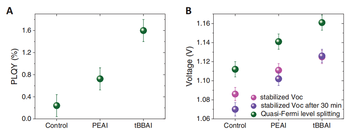 近日,天津大学的李祥高教授联合洛桑联邦理工大学的yuhang Liu和Michael Grätzel(共同通讯)在Adv. Mater.上发表了一篇题为“Tailored Amphiphilic Molecular Mitigators for Stable Perovskite Solar Cells with 23.5% Efficiency”的文章。在这项工作中,研究人员量身定制了基于碘化苄基铵的缺陷缓解剂,从而使PCE达到23.5%。构思并合成了新型分子钝化剂4-叔丁基-苄基碘化铵(tBBAI)。 tBBAI的庞大叔丁基取代基可防止空间排斥引起的有害聚集。tBBAI表现出出色的钝化能力,这是由于钙钛矿薄膜中光致发光量子产率(PLQY)的提高以及较大的准费米能级分裂(ΔEF)所致,从而导致高开路电压(VOC)为1.142V。本研究使用的钙钛矿富含碘化物,I:Br = 97:3,光学带隙低至1.55 eV。因此,优化器件的电压损耗约为410 mV,接近辐射极限的90%。这被认为是PSC的最低电压损耗之一。时间分辨光致发光(TRPL)实验表明,具有tBBAI界面层的PSC与控制装置相比,从钙钛矿层到HTL的电荷转移增强,这可能是由于高极化钙钛矿层与高钙钛矿层之间的更好接触而导致空穴提取势垒降低。非极化HTL,导致填充因子(FF)显着改善,比75%改善了82%。另外,具有更多疏水性叔丁基取代基的器件赋予了tBBAI钝化钙钛矿,更好的耐湿性。 这些结果结合起来,高效的介观PSC达到了PCE的23.5%,其中VOC和FF分别高达1.142 V和82.1%。除了出色的PV性能外,tBBAI钝化的PSC在模拟全日照下500 h的PV运行期间仍可保持其初始效率的95%以上。