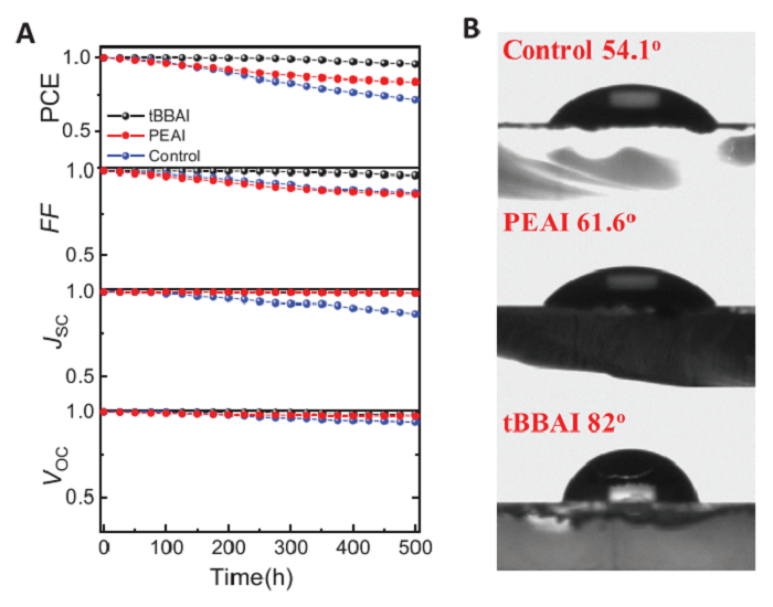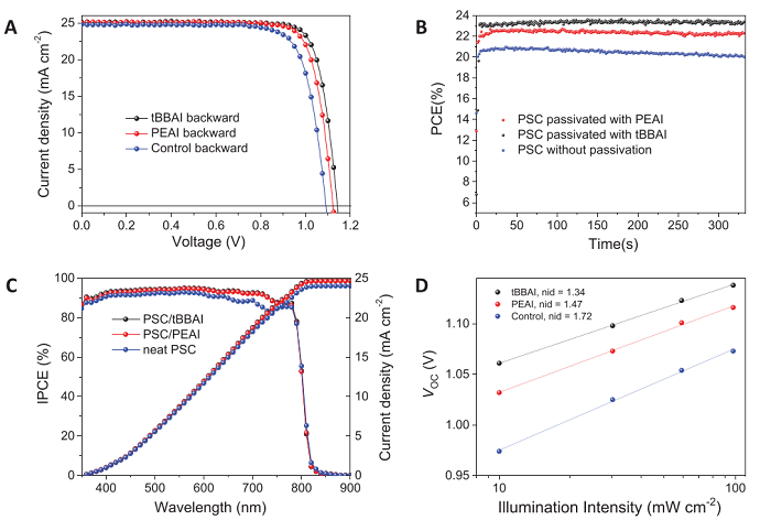 A)MPP老化会在惰性气氛(N2)中,并在1个阳光下连续照射不钝化的PSC,以及用PEAI和tBBAI钝化的PSC;
