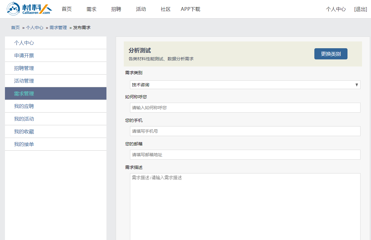 在活动期间,登陆材料人网(https://www.cailiaoren.com),进入个人中心–需求管理,点击发布需求,然后找到分析测类别即可进入。