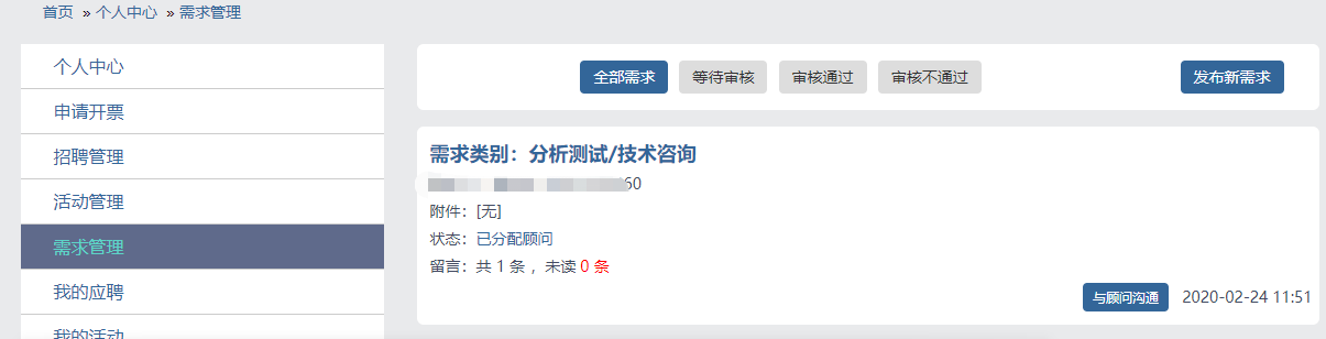 提交之后,请在个人中心-需求管理页面查看需求状态,如果被分配了HTH官网地址 顾问,就可以进入页面与HTH官网地址 顾问沟通了