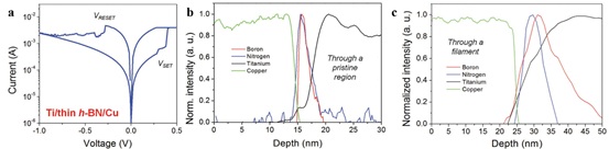图10. Ti/thin h-BN/Cu忆阻器的丝开关机制