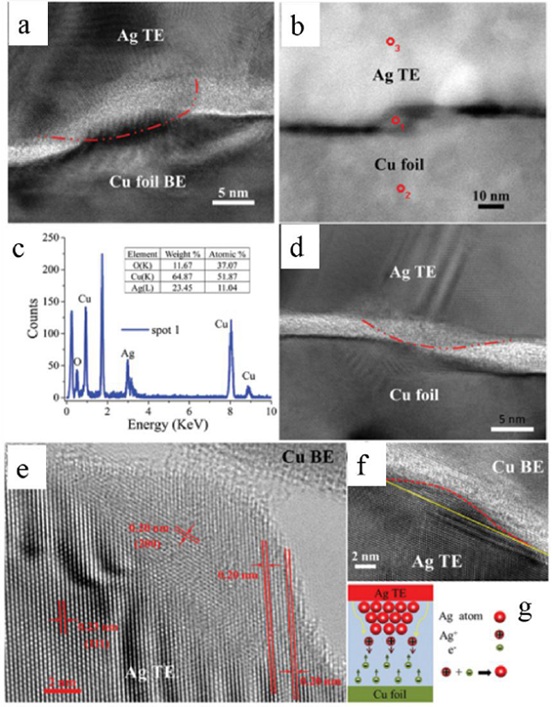 (f, g) Ag 导电细丝的HRTEM图像,h-BN基器件的导电细丝生长原理图。