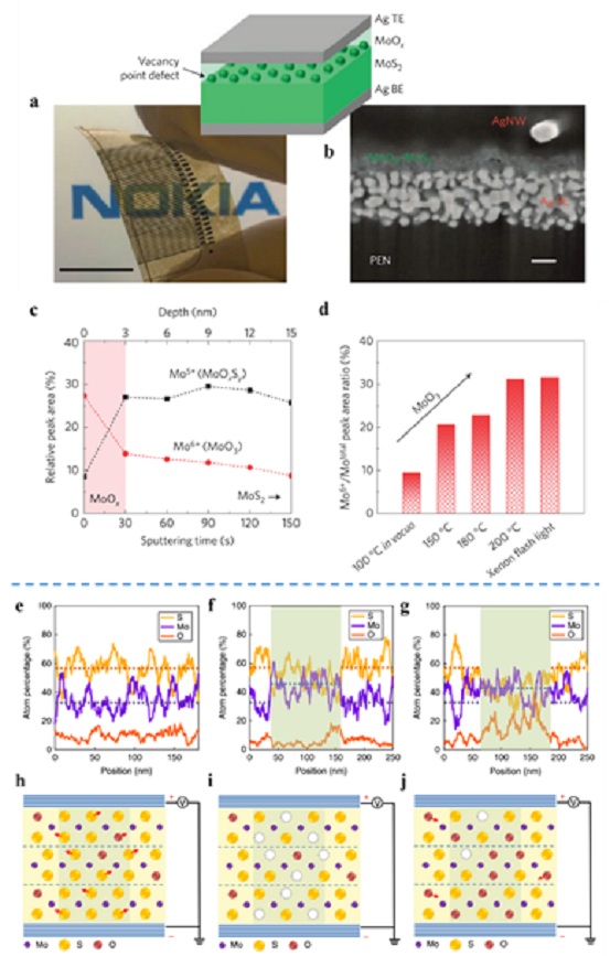(a-c) MoOx/MoS2忆阻器示意图,SEM图像及XPS剖析图;