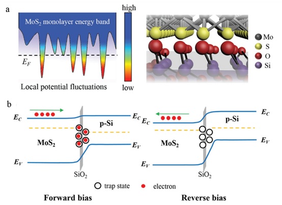 (a) 左图为具有局部电位波动的单层MoS2的能带结构,右图为具有悬浮Si-O键的MoS2\SiO2界面;