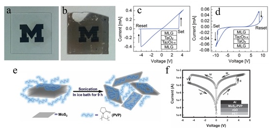 (e) 聚合物辅助剥离MoS2图示及其I-V曲线;