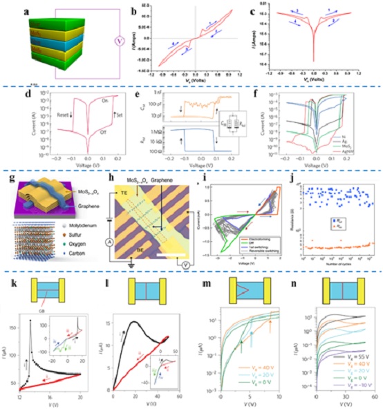 (d, e) MoOx/MoS2储存器的基本I-V曲线 (d),(e)为其电容和电阻部分;