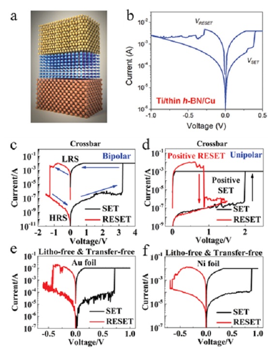 (a, b) Ti/thin h-BN/Cu器件的结构图示及忆阻器的经典I-V曲线;