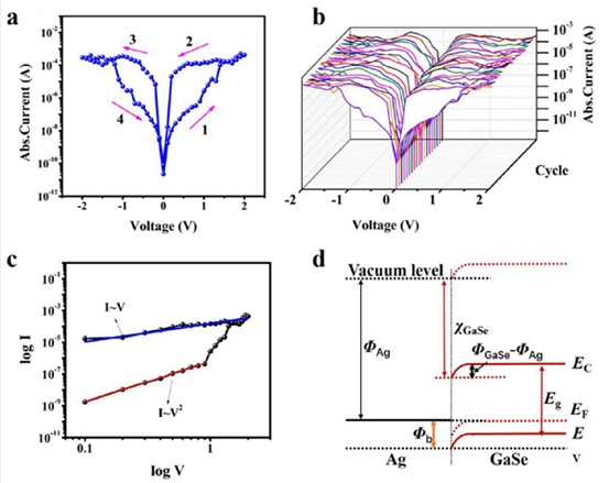 (a, b) Ag/GaSe/Ag器件的I-V曲线及50次数据循环曲线;