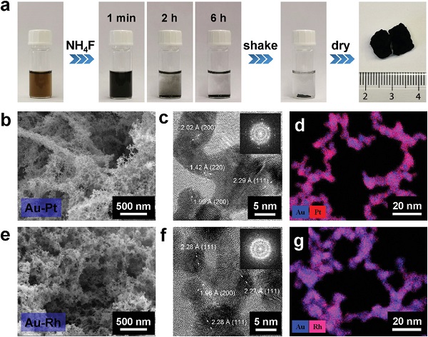 (a)NH4F诱导的Au-Rh纳米颗粒溶液凝胶化以及对应气凝胶的图片