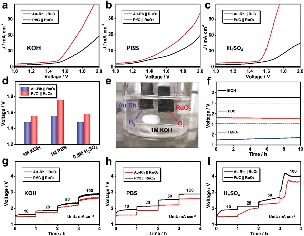 (e)Au-Rh气凝胶|| RuO2电解槽在1 M KOH溶液中进行水裂解的示意图