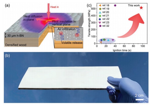 图1.示意图展示了BN致密木材的工作原理,展示了更高的耐火性和机械性能