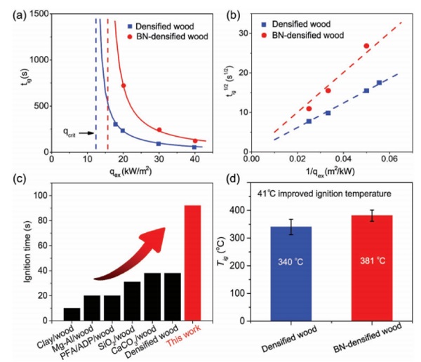 c)将BN致密木材的拉伸强度和点火延迟时间与其他地方报道的耐火木材的结果进行比较