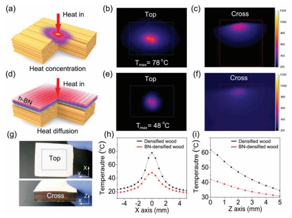 a)BN致密木材的导热性和隔热性示意图