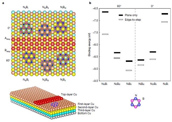 台湾国立交通大学的Wen-Hao Chang、台积公司(TSMC)的Lain-Jong Li以及美国莱斯大学的B. I. Yakobson(共同通讯作者)等人联合发文报道了蓝宝石晶圆上成功外延生长单晶六方氮化硼单层。以往理论认为,六方氮化硼单层无法在高对称的铜(111)金属表面实现单向生长。然而,研究人员却意外发现六方氮化硼与铜(111)横向对接(lateral docking)之后,可以增强六方氮化硼的外延生长,并保证了该外延生长是单向的。研究还发现,由此制备的单晶六方氮化硼可以集成到二硫化钼和二氧化铪之间作为界面层,能够大大增强晶体管的电学性能。该研究认为,这一可用于生产晶圆级单晶六方氮化硼的方法为实现新型二维电子器件奠定了基础。2020年03月04日,相关成果以题为“Wafer-scale single-crystal hexagonal boron nitride monolayers on Cu (111)”的文章在线发表在Nature上。