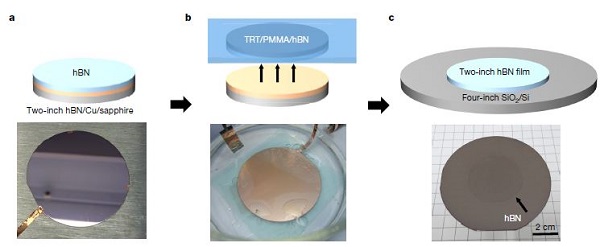 图4 晶圆级六方氮化硼转移过程的示意图以及光学照片