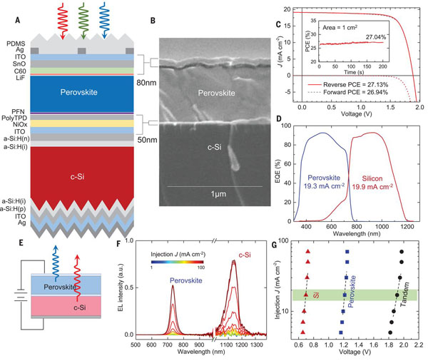 图5 1-cm2双端钙钛矿/硅晶体管的PV特性