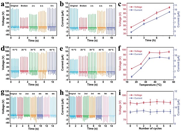 (f)在不同温度下修复9 h后,IU-TENG的电压和电流随修复温度的变化;