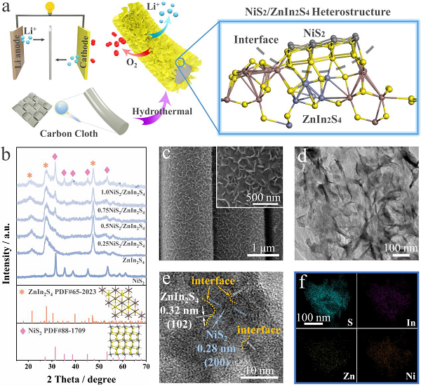 (a) Li-O2电池中碳布上形成的NiS2/ZnIn2S4异质结示意图;