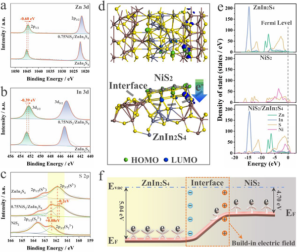 (f) NiS2 和ZnIn2S4的异质界面示意图。