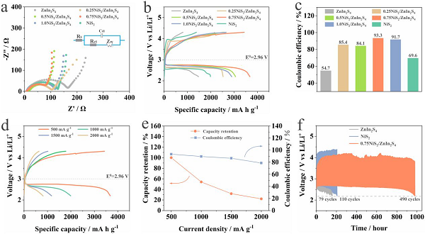 (e) 0.75NiS2/ZnIn2S4电极的容量保留率及库伦效率对比;