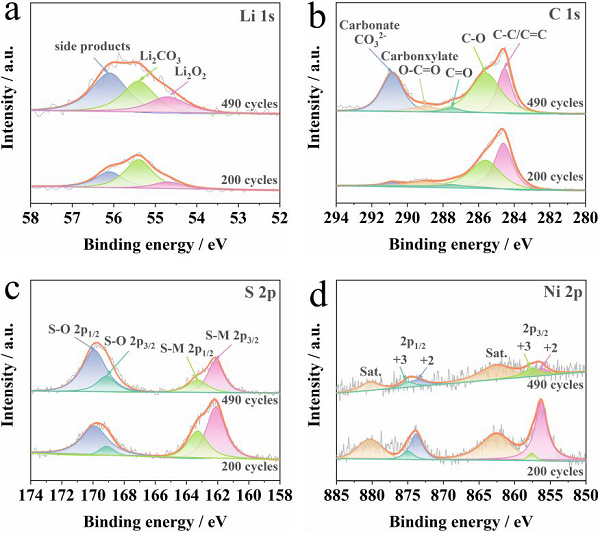 (a-d) 0.75NiS2/ZnIn2S4电极在分别循环200次和490次后的Li 1s、C 1s、S 2p和Ni 2p XPS谱图。