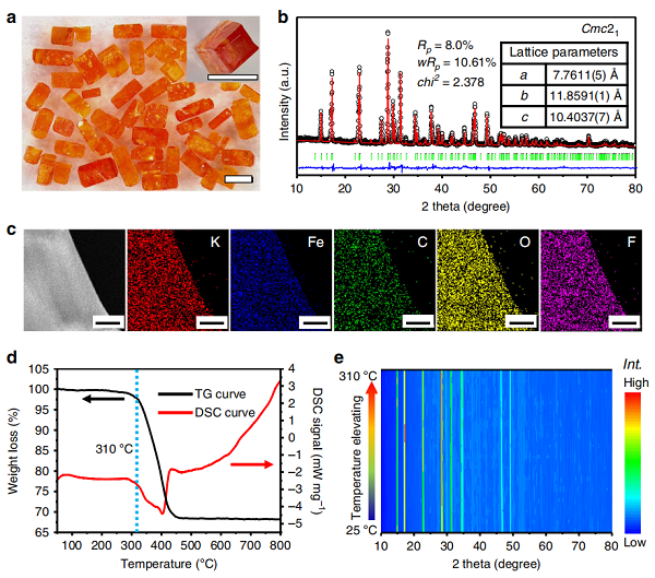 钾离子电池具有低成本和高倍率性能的优势,可用于大规模的能量存储。然而,由于缺乏合适的正极材料,钾离子电池的发展仍处于起步阶段。本文证明了先前已知的磁阻材料KFeC2O4F可以用作钾离子存储的稳定正极,并在0.2 A g-1时具有约112 mAh g-1的放电容量,且在2000次循环后容量保持在94%。其高循环稳定性归因于刚性骨架结构及三个钾离子扩散通道的存在,当发生Fe2+/Fe3+氧化还原反应时,其本征的结构特征可将体积波动降至最低。此外,将此KFeC2O4F正极与软碳负极匹配制得的钾离子全电池,其倍率性能优异,在200个循环内容量衰减几乎可忽略不计。
