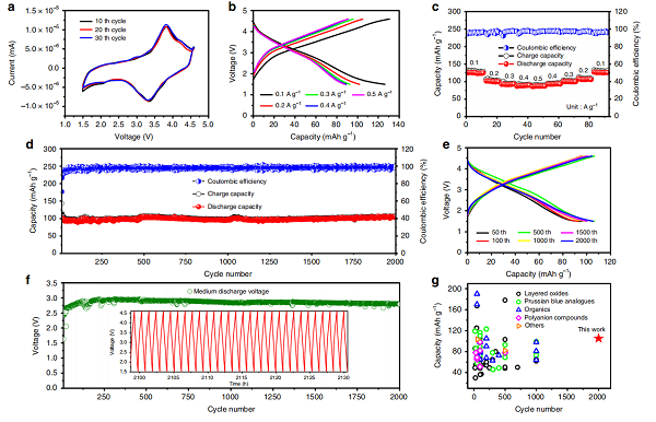 g)与已报道的钾电正极材料的循环稳定性比较。