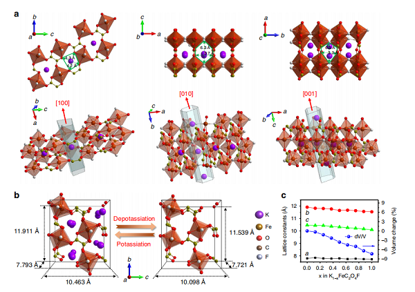 a)K1-xFeC2O4F在原始、半充和满充状态(x = 0、0.5、1)时的原子结构;