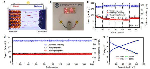 近日,中国科学院深圳先进技术研究院的唐永炳研究员带领团队与清华–伯克利深圳学院的成会明教授合作在Nat. Commun.上发表了一篇题为“A fluoroxalate cathode material for potassium-ion batteries with ultra-long cyclability”的论文。研究人员发现磁性材料KFeC2O4F具有类似于普鲁士蓝类似物(PBAs)的3D开放结构,这对于钾离子存储非常有优势。因此,研究人员通过实验和理论方法对KFeC2O4F作为KIBs正极材料进行了系统的电化学研究。经过优化后,获得112 mAh g-1的稳定容量,在2000次循环后具有94%的容量保持率,单次循环容量衰减为0.003%,这是目前已有报道里最稳定的KIBs正极材料。此外,将该KFeC2O4F正极与软碳负极匹配构建的钾离子全电池可表现出约85 mAh g-1(基于正极的质量)的可逆容量及优异的倍率性能,在200个循环内容量衰减可忽略不计。该工作为开发高稳定和低成本的钾型储能体系提供重要支持。