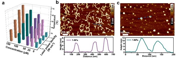 (a)在不同功率密度下,655 nm激光辐照下3 min,不同浓度1-NFs的PBS溶液中的升温柱状图;