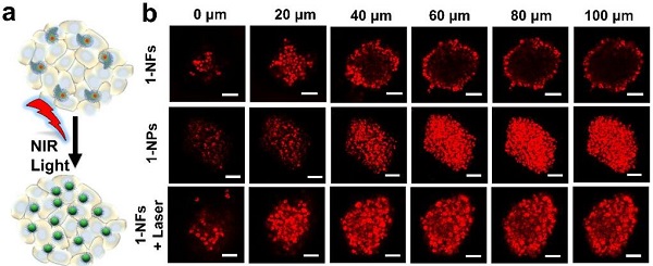 (a)近红外激光引发的1-NFs向1-NPs转变及MCS深度渗透的示意图;