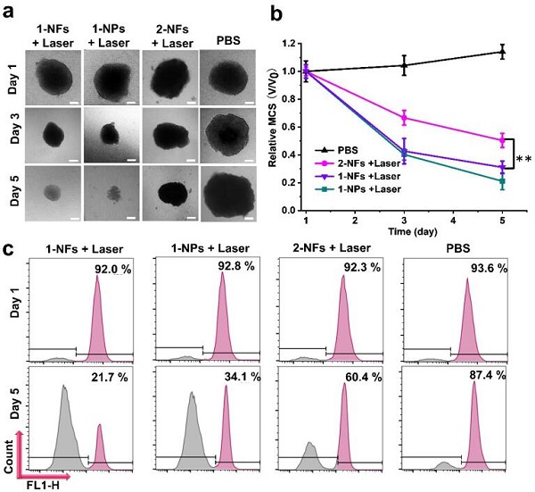 (a)用aza-BODIPY浓度为25 μM的1-NFs+激光、1-NPs+激光、2-NFs+激光(参照物,详见论文)和PBS处理的MCF-7 MCS的代表图像;