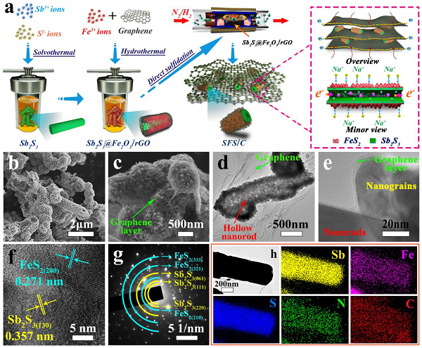 近期,中南大学欧星副教授和东北大学骆文彬教授(共同通讯作者)等人利用两步溶剂热法成功制备了镶嵌在氮掺杂石墨烯基体中的Sb2S3@FeS2空心纳米棒(SFS/C)分级复合结构,并将其用作钠离子电池负极材料。二元金属硫化物不同组分之间的异质界面不仅诱导产生了内建电场,加快了Na+扩散速度和界面电荷转移,而且还为电化学反应增加了活性位点。此外,Sb2S3@FeS2空心纳米棒镶嵌在N-掺杂石墨烯基体中的分级复合结构,可以缓解充放电循环所带来的体积膨胀,确保较大的反向容量。集空心分级纳米结构、异质晶体和异质结诱导协同耦合效应等众多优点于一身的SFS/C复合材料,其表现出了优异的Na+存储性能。在5 A/g的电流密度下,SFS/C的可逆比容量为534.8 mAh/g,且1000次充放电循环后的比容量保持率为85.7 %,而且在10 A/g的超高倍率下,其比容量可达537.9 mAh/g。该项研究以题为“Bimetallic Sulfide Sb2S3@FeS2 Hollow Nanorods as High-Performance Anode Materials for Sodium-Ion Batteries”发表在ACS Nano上。