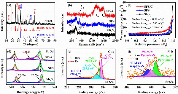 (a-c) SFS/C的XRD、拉曼光谱和N2吸脱附曲线;