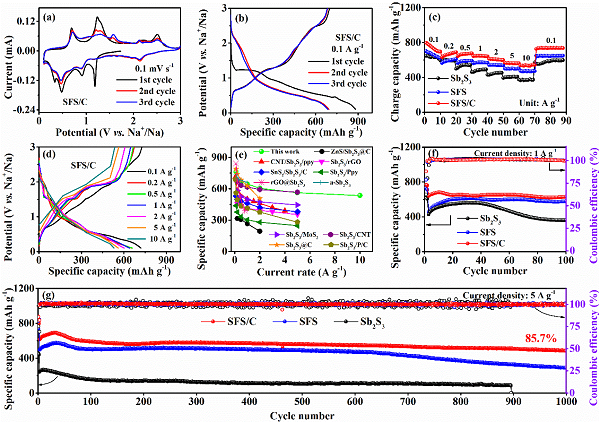 (c) Sb2S3、 SFS和SFS/C在不同电流密度下的倍率性能;