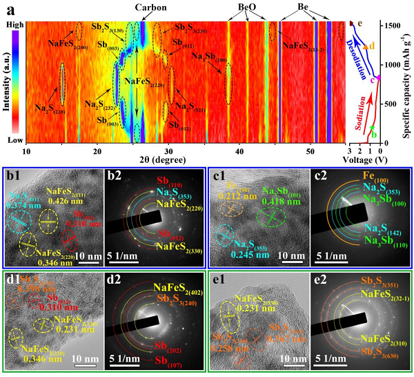 (a) SFS/C电极在初始钠化和去钠化循环中,相对于充放电曲线的XRD等高线图;