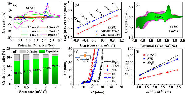 (e) SFS/C电极与其他用于SIBs的Sb2S3基负极性能对比图;
