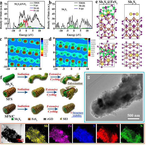 (a-e) 计算的TDOS、界面处的电子密度差分图以及在最稳定的吸附构型下Na2S的结合能:SFS/C(a, c, e), Sb2S3(b, d, e);