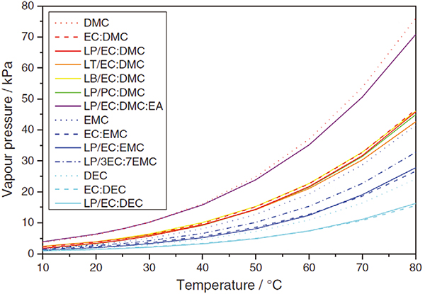 在高温下运行至少需要使用挥发性低的电解质,该电解质可以利用蒸汽压(VP)来防止液体电解质流失,甚至可以防止电池内部局部干燥,因为通常将一定量的电解质限制在实际的圆柱体中, 棱柱形和冲孔电池可提高重量比能量密度。图七给出了碳酸盐溶剂和碳酸盐基电解质的蒸气压随温度的变化曲线。