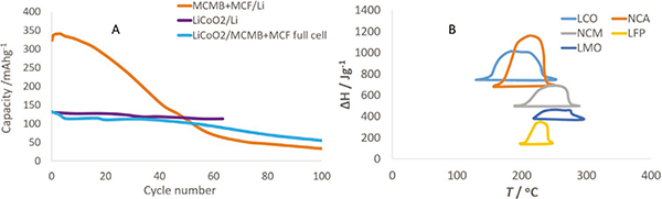 图九、负极高温下循环性能和正极的热稳定性(A)在60°C温度下,全电池(LCO/MCMB+MCF)和两个半电池细胞(MCMB+MCF/Li和LCO/Li)的循环性能;