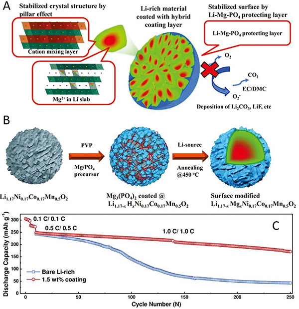 图十、由保护层保护的正极材料循环性能(A)在Li17Ni0.17Co0.17Mn0.5O2(0.4Li2MnO30.6LiNi1/3Co1/3Mn1/3O2)正极材料上由Mg2+和Li-Mg-PO4层组成的混合表面保护层的原理图;
