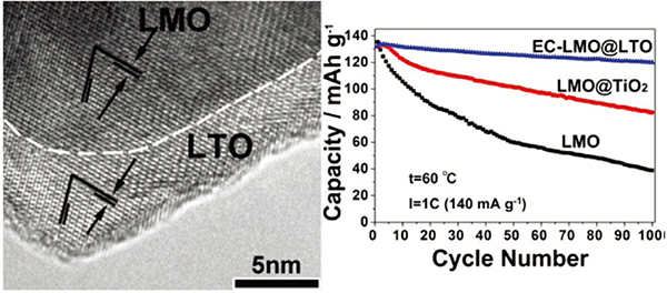 图十一、LMO上LTO涂层的HRTEM及其在60°C下的循环稳定性
