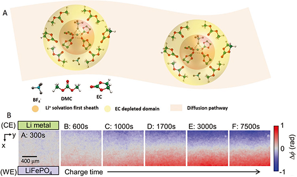 图一、循环过程中电解质变化(A)在EC+DMC电解质中Li+溶剂化鞘层及结构的原理图;
