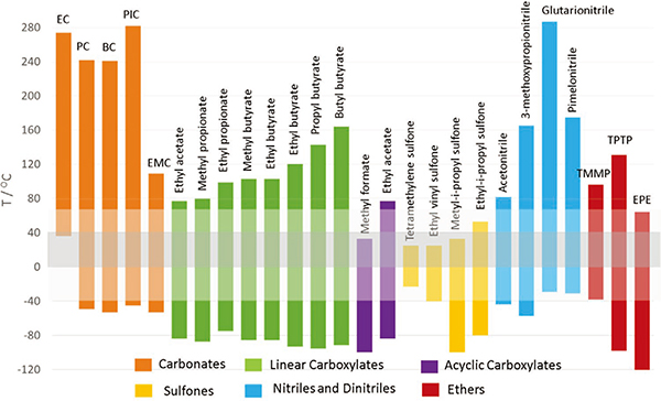 图2总结了文献报道中的通常具有低融点的不同溶剂的融点和沸点。由于EC在形成SEI的电解质中必不可少,可以选择其他溶剂如直链羧酸盐等。