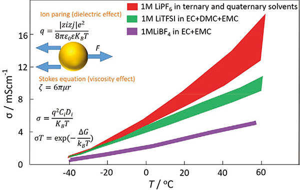 除溶剂以外,Li盐对电解质的影响,通常可以使用Stokes-Einstein方程来描述液体扩散来进行表征。根据图三所示的Stokes方程,仅考虑粘度效应,其中迁移率μ是阻力系数ζ的倒数,该阻力系数是扩散物体的动量弛豫时间的倒数。另外,为了使溶剂化的离子在电场下迁移,必须防止溶剂化的溶剂与它的抗衡离子形成紧密的离子对,这可以描述为介电效应。因此,扩散率受这两个因素影响。电导率降低的内在本质直接与介电常数和零度以下温度下的粘度变化有关。图三给出了三种Li盐在不同溶剂、不同温度下的电导率。关于电解质电导率下降所引起的欧姆极化,我们可以初步估算一下:假设阴极的面密度(0.252 g / cm2),隔膜厚度(25μm)以及低温下的孔隙率(60%),那么LFP在-40°C的1/2 C下放电,则电解质的欧姆损耗将为0.42V。