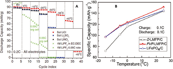 图四A给出LCO在水性和基于EC的电解质的不同温度下的容量。在LiCl电解质下,LCO在低至-40°C的温度下仍能保持其室温容量的近72%。 这些发现表明,LCO能够在低于零温度的温度下提供相对较高的容量,换句话说,LCO本体材料的Li扩散率足够快,能满足Li嵌入和脱嵌的动力学。因此数据有力的证明了,在传统的基于EC的电解质上观察到的性能低下可能是由于阳极或者界面过程缓慢造成的。另外,图四B也说明了寻找应该寻找温度活化能低的正极材料也是一种有效的方法。